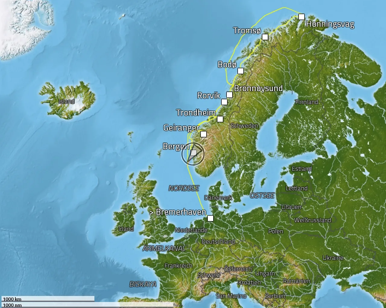 Bremerhaven - Heimaey - Hafnarfjörður (Reykjavik) - Akureyri - Lerwick - Ålesund - Bergen - Farsund - Bremerhaven