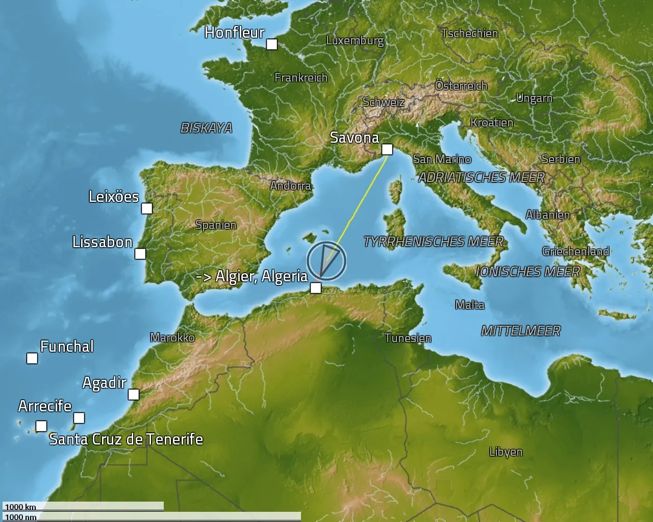 Fahrt: 16.5 Knoten (30.6 km/h)