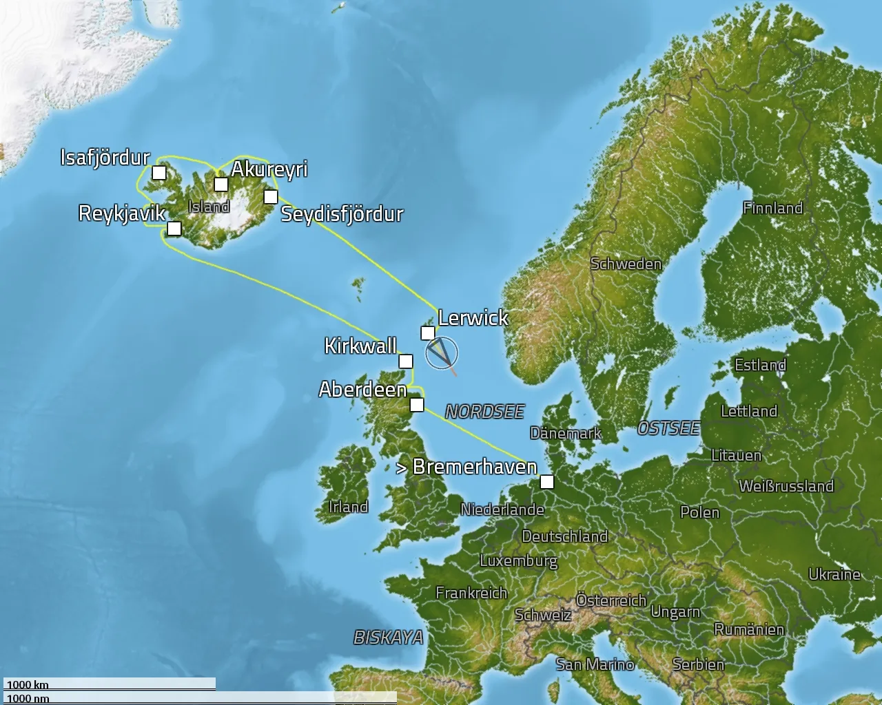 Cuxhaven - Tilbury (London) - Dartmouth - St. Mary's - Ferrol - Santander - Pesaia - Bordeaux - Concarneau -Zeebrügge (Brügge) - Oudeschild - Bremerhaven