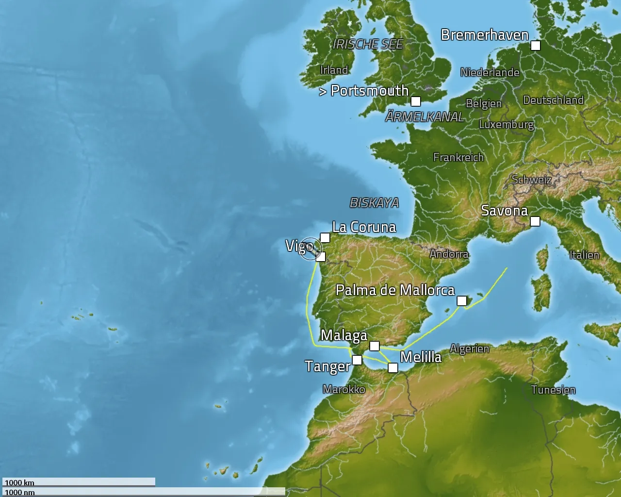 Bremerhaven - Rosyth (Edinburgh)- Fort William - Belfast - Greencastle - Galway - Foynes - Ringaskiddy (Cork) - Portsmouth - Bremerhaven